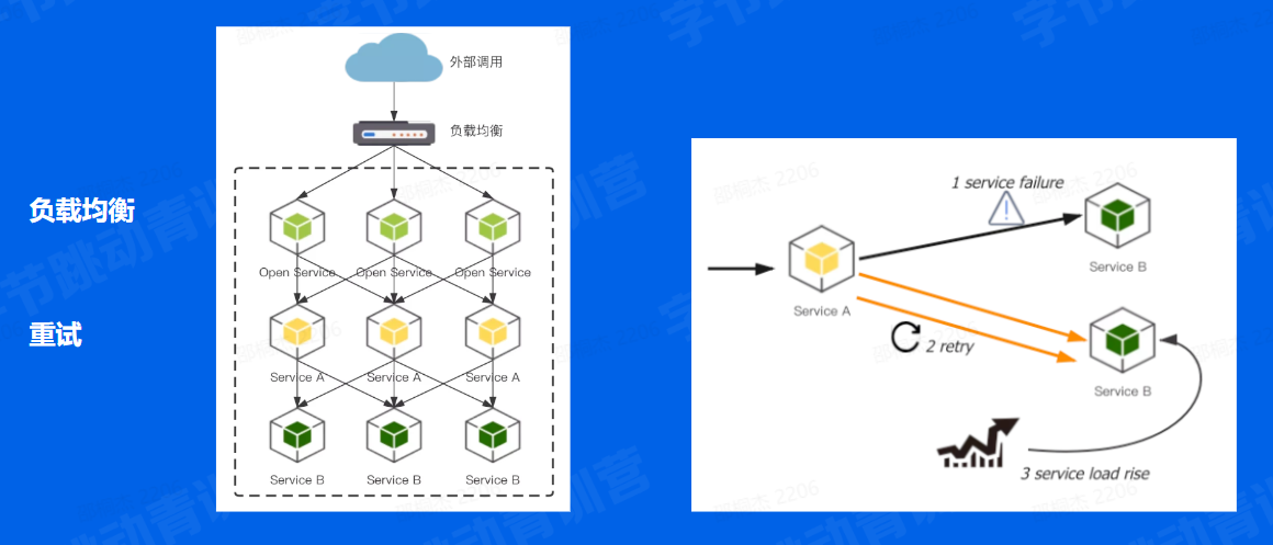 首先,重试会加大直接下游的负载。如下图,假设 A 服务调用 B 服务,重试次数设置为 r(包括首次请求),当 B 高负载时很可能调用不成功,这时 A 调用失败重试 B ,B 服务的被调用量快速增大,最坏情况下可能放大到 r 倍,不仅不能请求成功,还可能导致 B 的负载继续升高,甚至直接打挂。