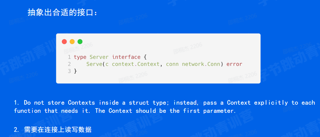 第二个,再一个是肯定要把连接传进来,因为我们要往连接上读其他的应该是不再需要了。数据、写数据对吧?那其他的还有没有呢?那我们的返回值是一个 error。那也说只要是任何的一个协议,只要实现了这样的一个 serve 的接口,就可以注册到我们的框架当中来。