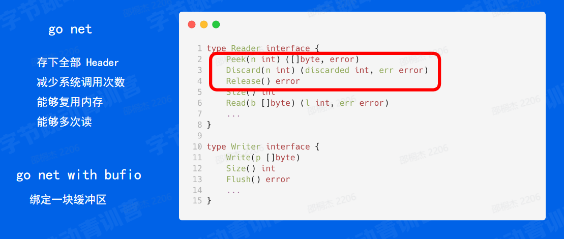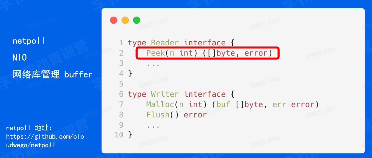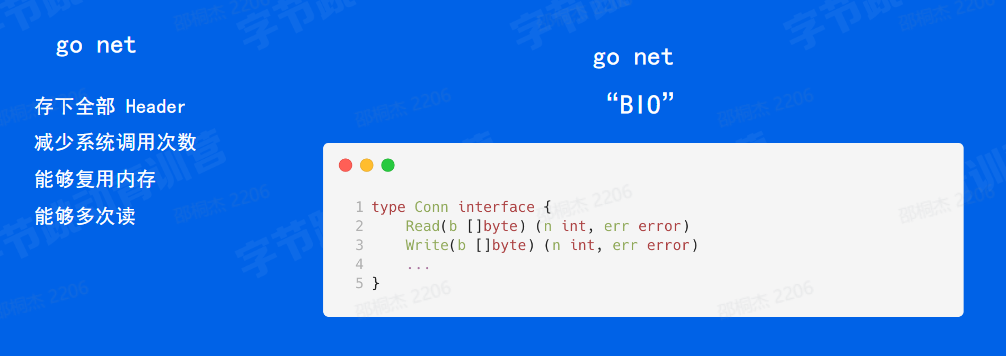在用户态来看。 那 go net 呢是由用户管理的 buffer,这两个接口都是传入 buffer,进行读或者写,那它本身是不管理buffer的。