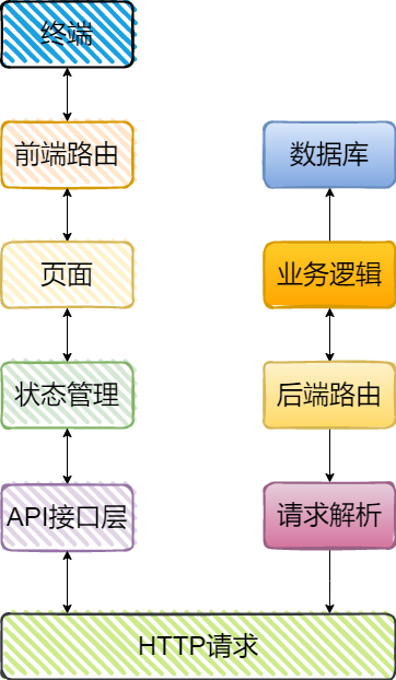 HTTP 协议是当今使用最为广泛的协议之一,HTTP是客户端与服务端通信的基础协议。像这一张图就是一个前后端分离的一个流程图了,前后端之间通过 HTTP 请求进行通信。那 HTTP 框架负责的就是对 HTTP 请求的解析、根据对应的路由选择对应的后端逻辑了,也就是图上标出来的这些。