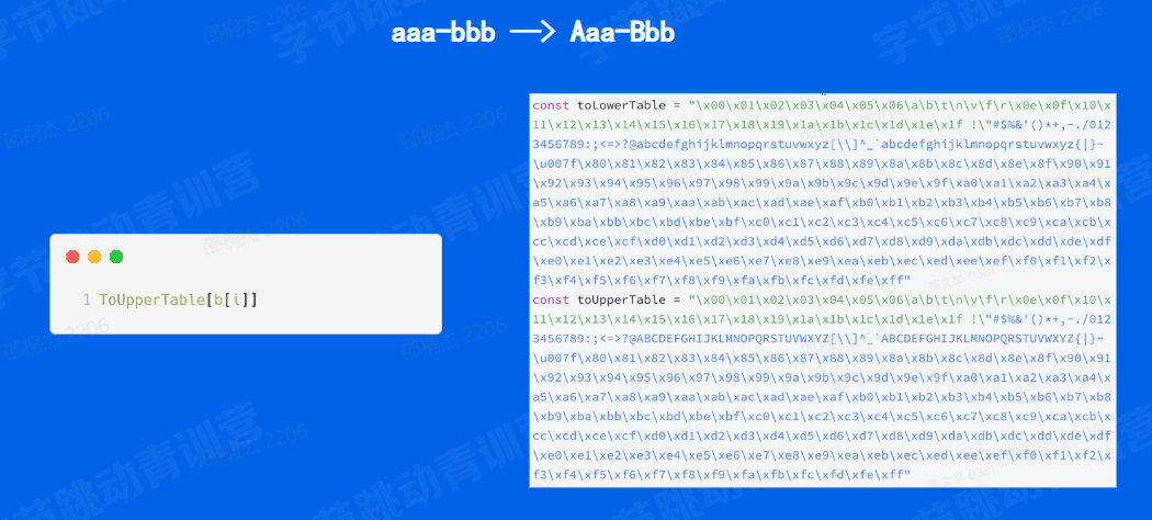 那我们把 byte 传递到我们的这个表表格里面来,然后查询到对应的返回,就是我们想要的一个大写或者小写了,那相当于我们直接是查表的方式,这个时间复杂度非常的低,应该是个 big o1 的一个查询方式。 这就是我们在做 header key 的规范化的时候做的一个优化。