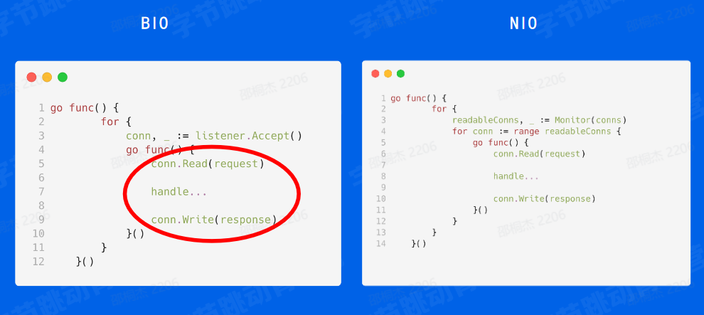 我们可以看下面这段代码,这段代码是go一个经典的connection处理,我们在一个 go function 里面维护一个 listener 那它 listener 每次 accept 获取一个连接之后,我们会开一个 goroutine 去单独处理它。这 goroutine 行为应该是先去读取数据,读取完之后然后处理业务逻辑,然后再把这个response写回去。这是一个比较经典的 go 的写法,那它就是一种 block io 编程模型。