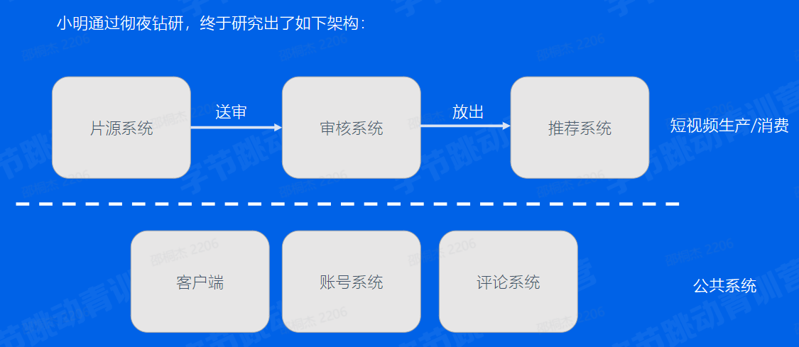 这里小明对短视频生产/消费链路做了更细粒度分解,分成了如图的几个服务。