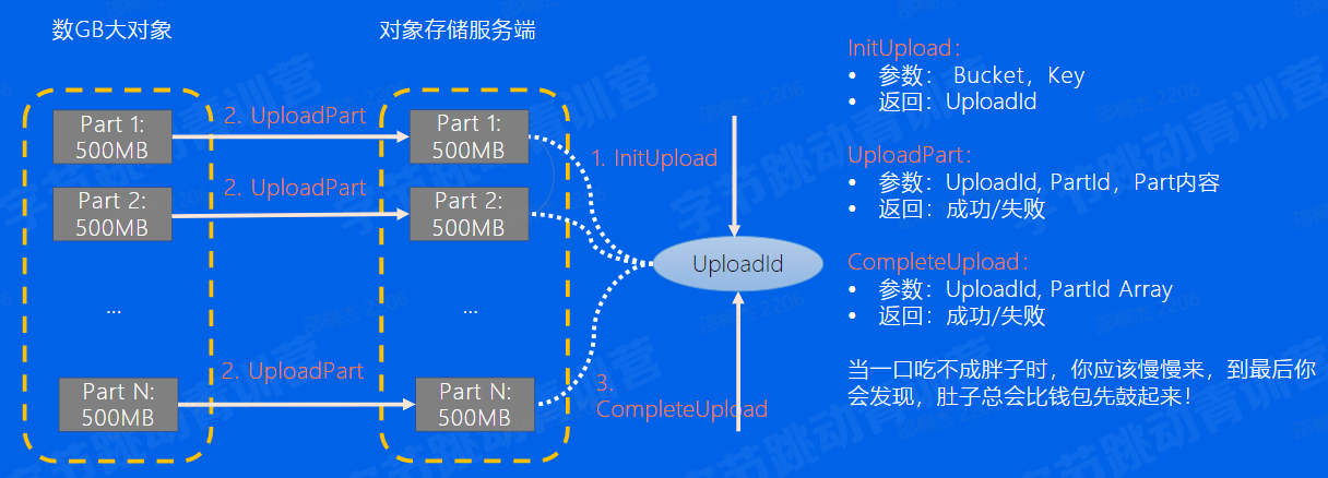 随着开发的深入,小明发现一个问题,自己上传数GB的大视频时,由于网络不好,总是上传到99%就网络卡住了,他很恼火,翻遍对象存储各类手册,终于发现了一个解决此场景的闪电三连鞭:MultiUpload