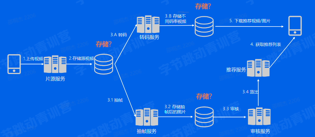 然后图下面还有个抽帧服务,将视频抽成不一样的帧,用于审核服务做审核,这里也需要有个存储把这些图片存储起来;