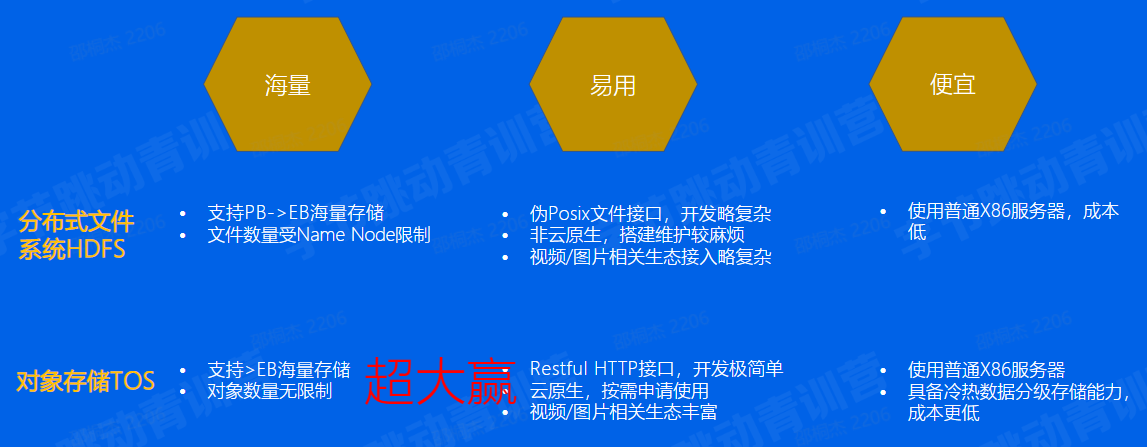 那分布式数据库呢,现代的分布式数据库在容量和弹性上面都有很大进展,是否可以呢?答案也是No,因为分布式数据库只适合存储结构化or半结构化数据。