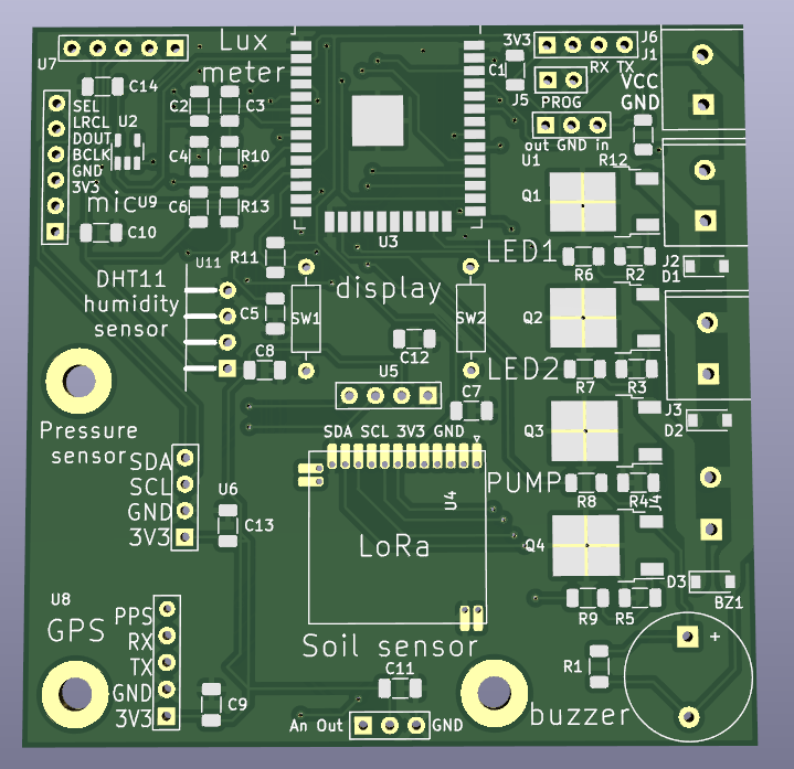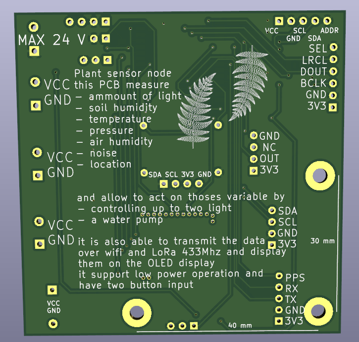 Sensors node to monitor ambient light, temperature, humitidy, noise and soil moisture. It it also able to drive a water pump and two light and have a LoRa transceiver to hopefully prevent my house plants from dying (among other use) it was designed with a few use case in mind : indoor plant, outdoor plant, weather station, mailbox notifier, environemental sensor (3 I2C port that can be used for with sensors @ 3V3) it is low power (when en deepsleep) (current draw under 50 uA@3V7 and even less at 12V)