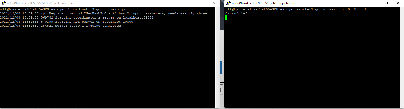 sudo wget https://raw.githubusercontent.com/nddq/CS-655-GENI-Project/main/worker.sh. Run the script usingsh worker.sh cdinto the worker folder and rungo run main.go 10.10.<worker number>.11to connect to the coordinator server. After a worker node is connected, a log should be output to the coordinator's terminal.