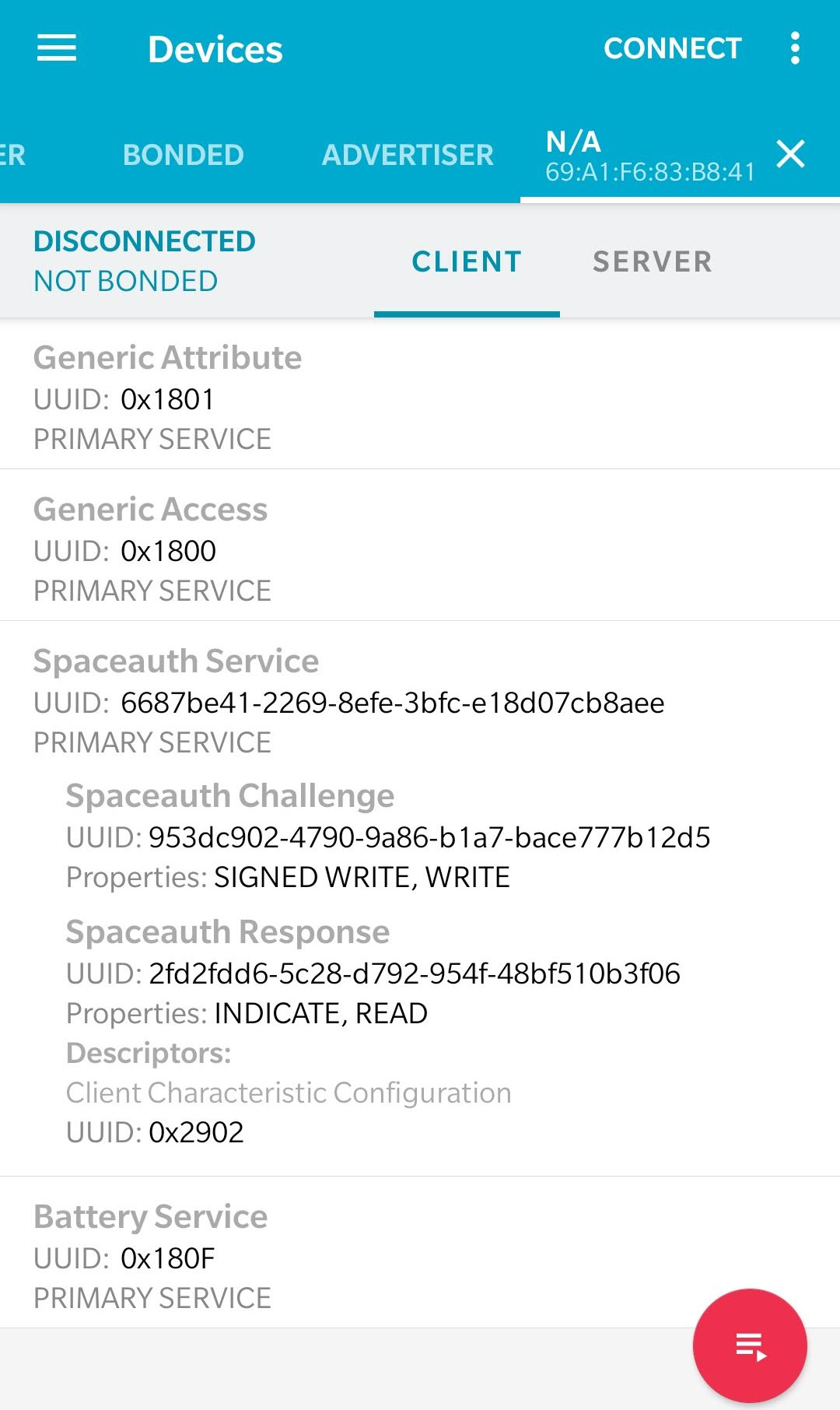 The spaceauth service expects a full BLAKE2s block (64B) of data to be sent to the challenge characteristic. Writing to this characteristic is protected and only available with a valid BLE bond. After the challenge has been received, a response (32B) is generated. The first few bytes of the response (as much as fits one MTU) are then indicated to the central.