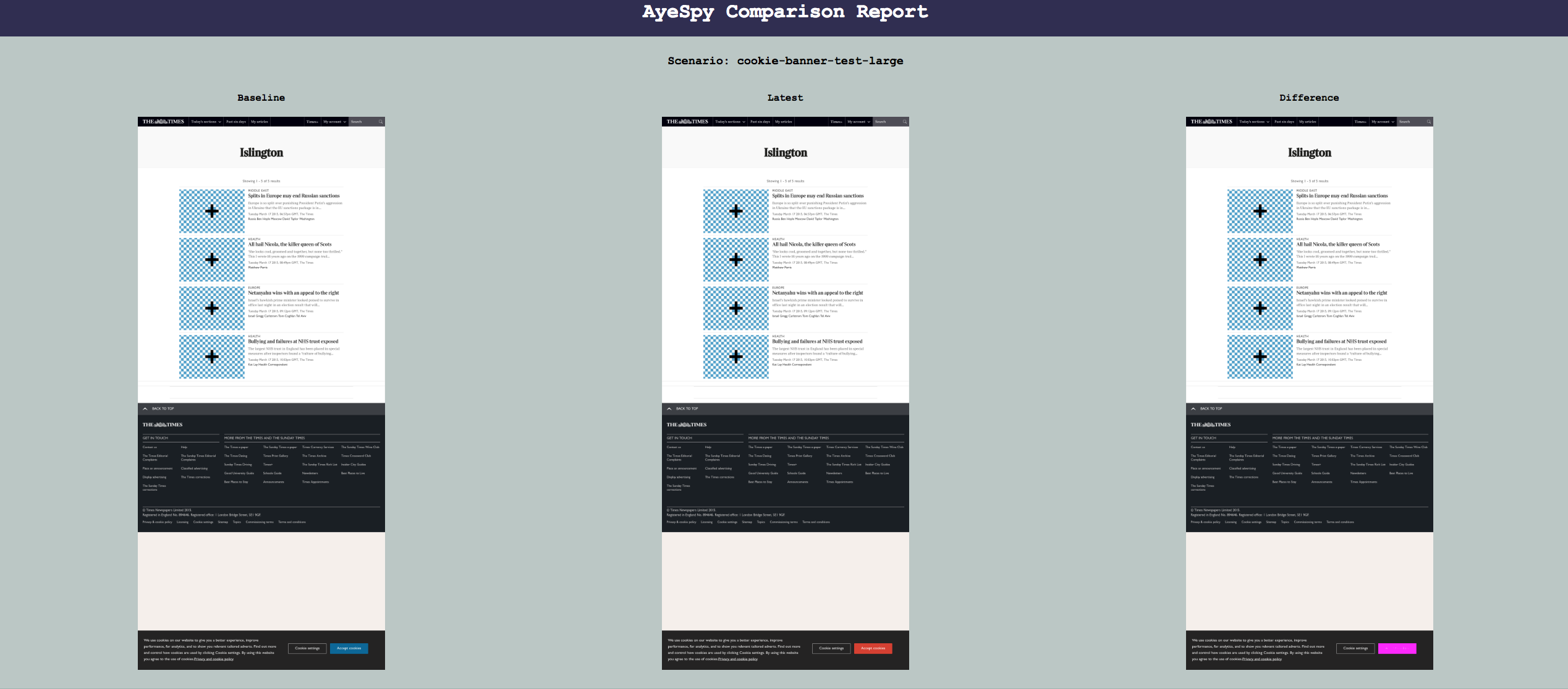 The application under test: Aye Spy is really effective when loading a page and screenshotting. You start to loose that value when you perform complicated setup journeys such as going through a checkout. Although possible with