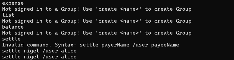 When using the settle feature while not in a group, the app does not give a response to the user. Whereas the other features do state that user is not signed in to a group.