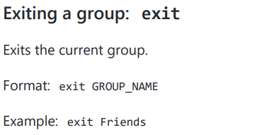 both the user guide and help menu state that the exit feature should be used by typing exit <group_name>. But when typing exit with the wrong group name, the app still exits the current group.