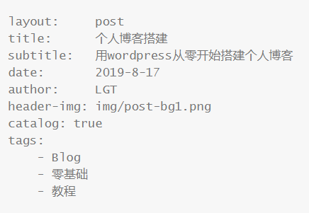 如果你用的是Typora,你可以在[段落]下找到[YAML front matter],然后直接输入你的头信息,当然你也可以使用markdown代码的形式,例如这样:
