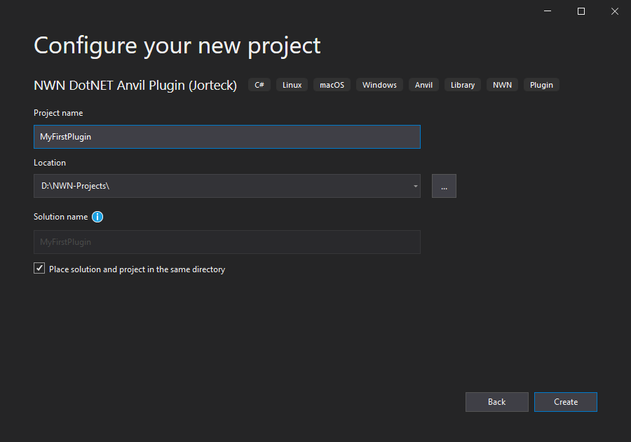 7. In the new project window, use the dropdown filters to find the "NWN DotNET Anvil Plugin" template, then click next.