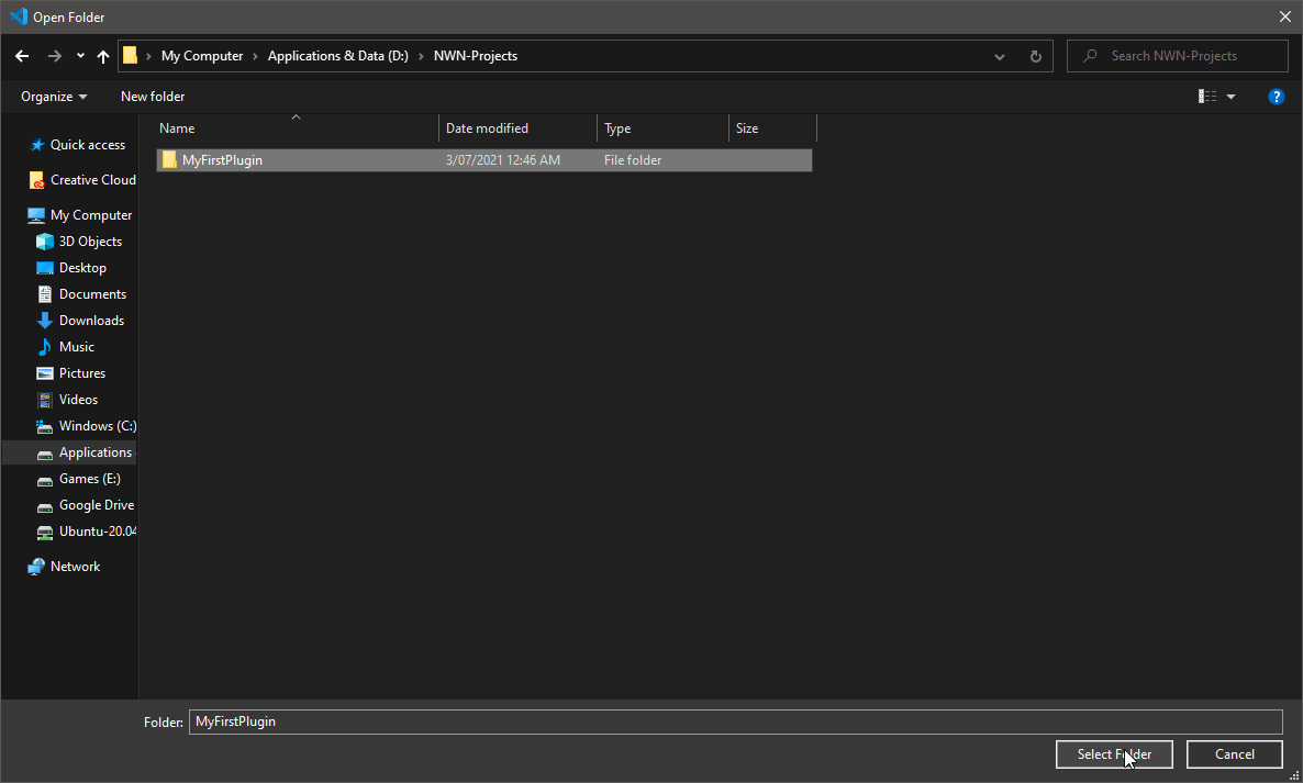 3. Navigate to/create a new empty folder. This folder will store the files for your plugin project