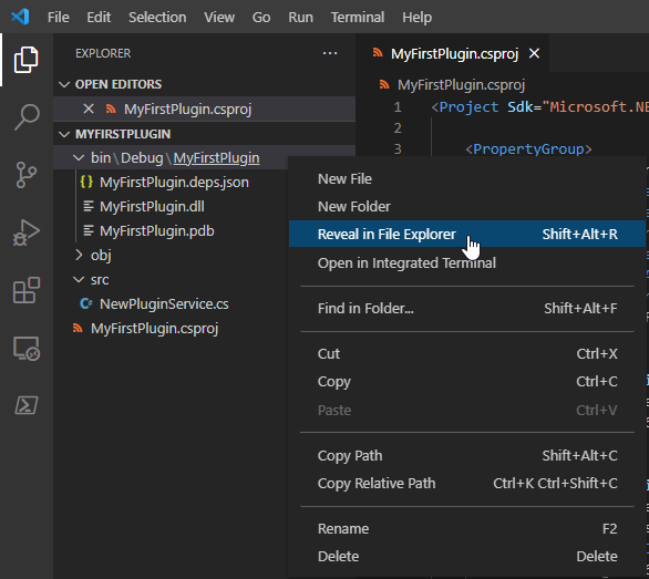 10. Click "Reveal in File Explorer" on the bin folder to navigate to it.