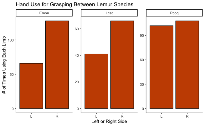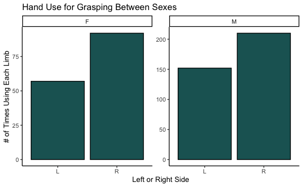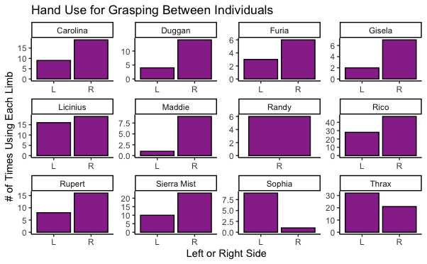 Individual lemurs varied with which hand they used more, and 10/12 (83%) used their right hand more often than their left hand. Randy (a male ring-tailed lemur, only grasped with his right hand when I observed him!). Thrax (a male sifaka) and Sophia (a female ring-tailed lemur) were the only lemurs that made more left-hand grasps than right-hand grasps: