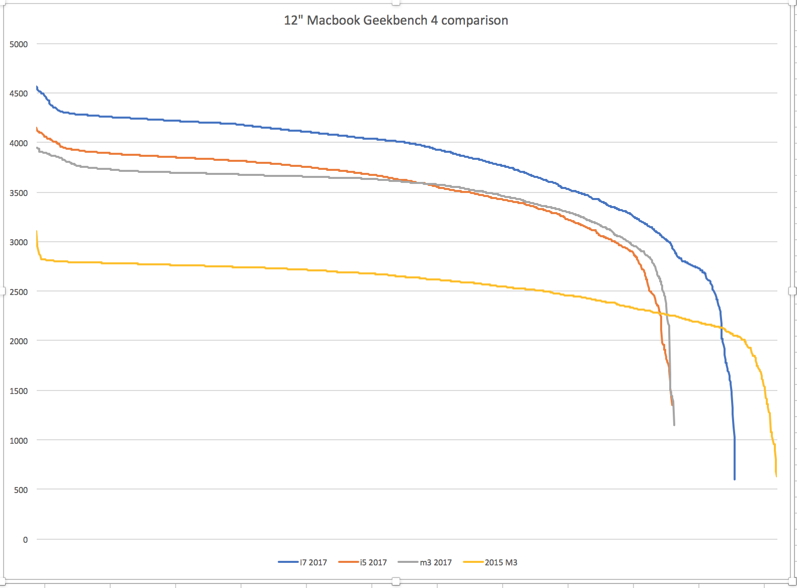 Lazy to create a Reddit account, but here are some plots for 12" Macbook, comparing the default 2015 model (M-5Y31) against the 2017 models. Used the search keywords from [https://everymac.com/ultimate-mac-lookup/?search_keywords=A1534] and Excel to plot the results.