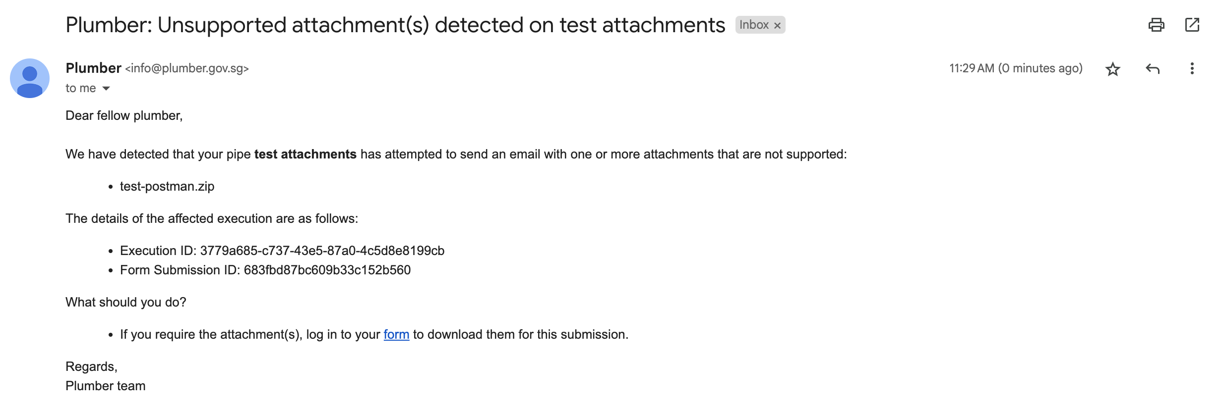 - [ ] Unsupported attachment notification (new) sent with details of unsupported attachment, submission id, execution id, link to form admin