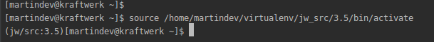 /home/janewayuser/jw/src/core/wsgi.pythen press restart. - Copy the "command for entering virtual environment" and paste this into your terminal to activate virtualenv. If this command has worked you will see (jw/src:3.6) or similar before your username in the terminal like below: