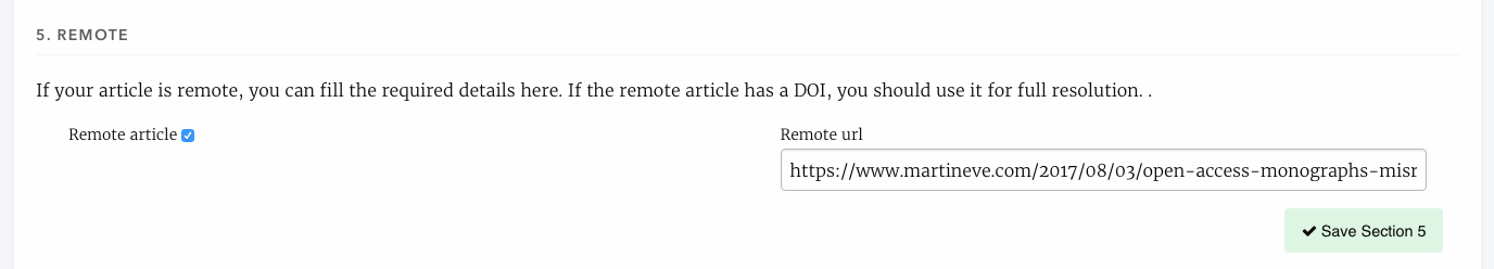 - On the remote section, check the Remote Article box and add your remote URL (see image below for example).