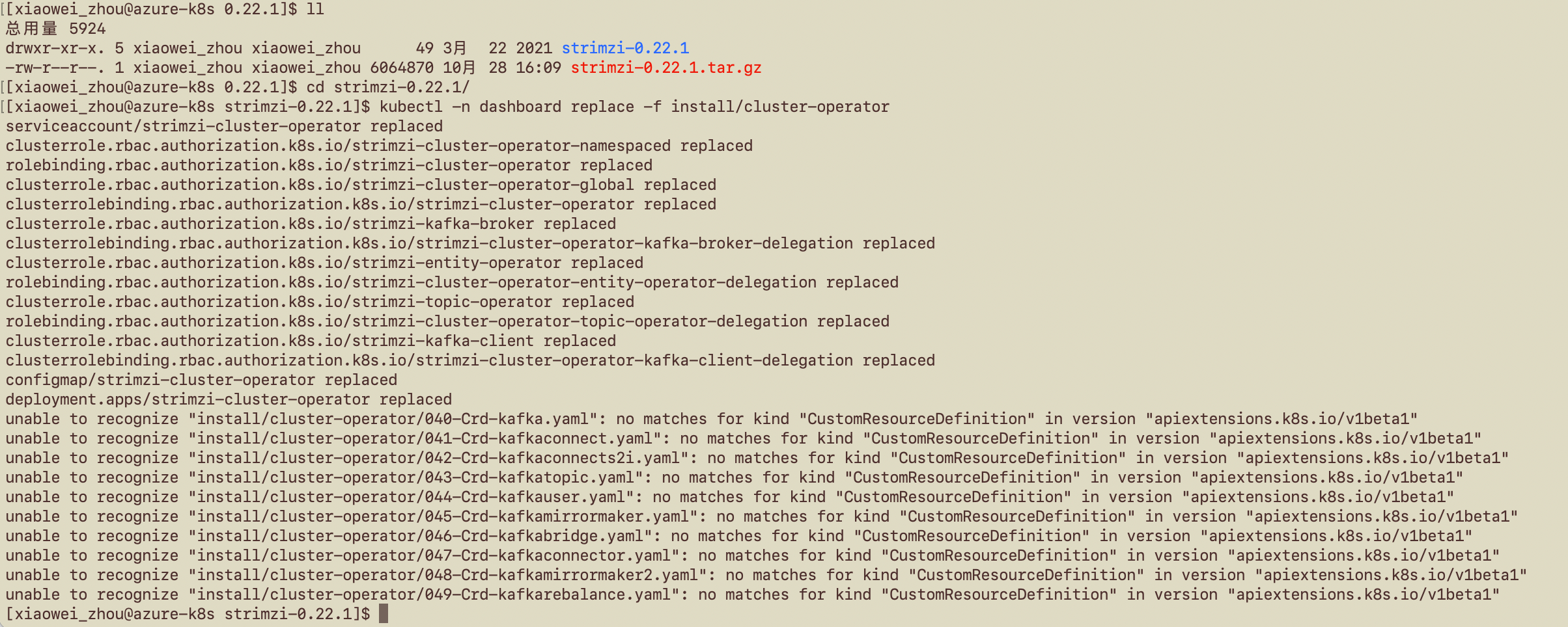 Hello, I was trying to update jaeger from 1.20 to 1.37, but it seems I have to update kafka frist: jaegertracing/jaeger-operator#1371 Then I try to update kafka cluster operator from 0.20 to 0.22, but my K8S is aks and version is already v1.22.6, Can somebody tell me what should I do now 😭 |