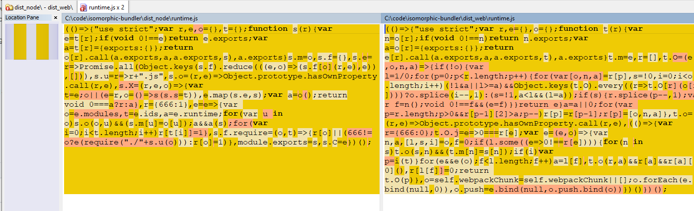 For a very basic webpack project, the emitted differences between the targets of "web" vs "node", the "production" build changes seem trivial, minification aside: