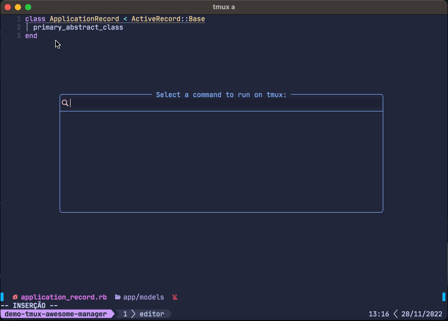 This plugin provides a pack of functionalities to work with TMUX on Neovim. Manage your commands and run inside neovim! π― This plugin is perfect for common commands of your workflow like yarn install, rails console, yarn add, bundle install, etc.