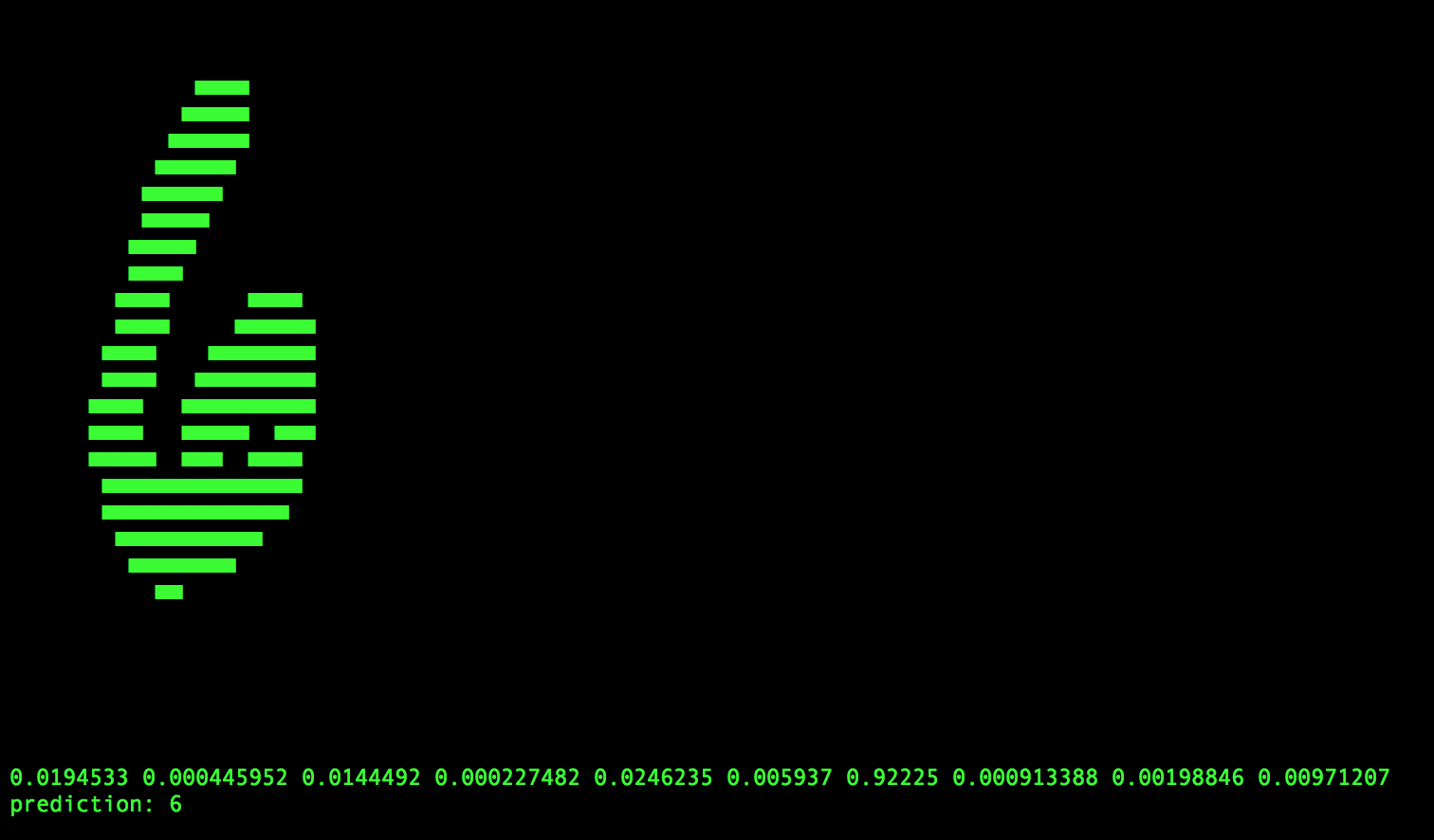 loss |> unpack_fltYes, we just used only 13 lines of code to implement the backpropagation. Actually, with some extra coding, we can make a smart application to recognise handwritten digits. E.g., running the application will give you the following prediction on handwritten digit 6. The code has been included in Owl's example and you can find the complete example in test_mnist.ml