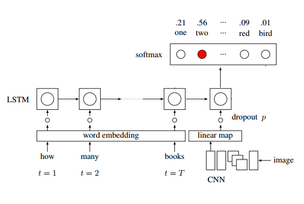 - The LSTM+VIS model is defined in vis_lstm.py. The input tensors for training are fc7 features, Questions(Word indices upto 22 words), Answers(one hot encoding vector of size 1000). The model depicted in the figure is implemented with 2 LSTM layers by default(num_layers in configurable).