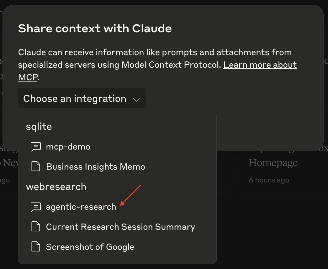 Simply start a chat with Claude and send a prompt that would benefit from web research. If you'd like a prebuilt prompt customized for deeper web research, you can use the agentic-research prompt that we provide through this package. Access that prompt in Claude Desktop by clicking the Paperclip icon in the chat input and then selecting Choose an integrationwebresearchagentic-research.