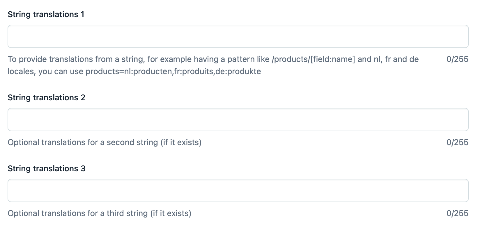 If you have non dynamic strings in the path and you want to localize them, that would be possible (until a max of 3) using the translations fields, for example having a pattern like /products/[field:name] and nl, fr and de locales, you can use products=nl:producten,fr:produits,de:produkte and products will be produkte on the slug field for de locale.
