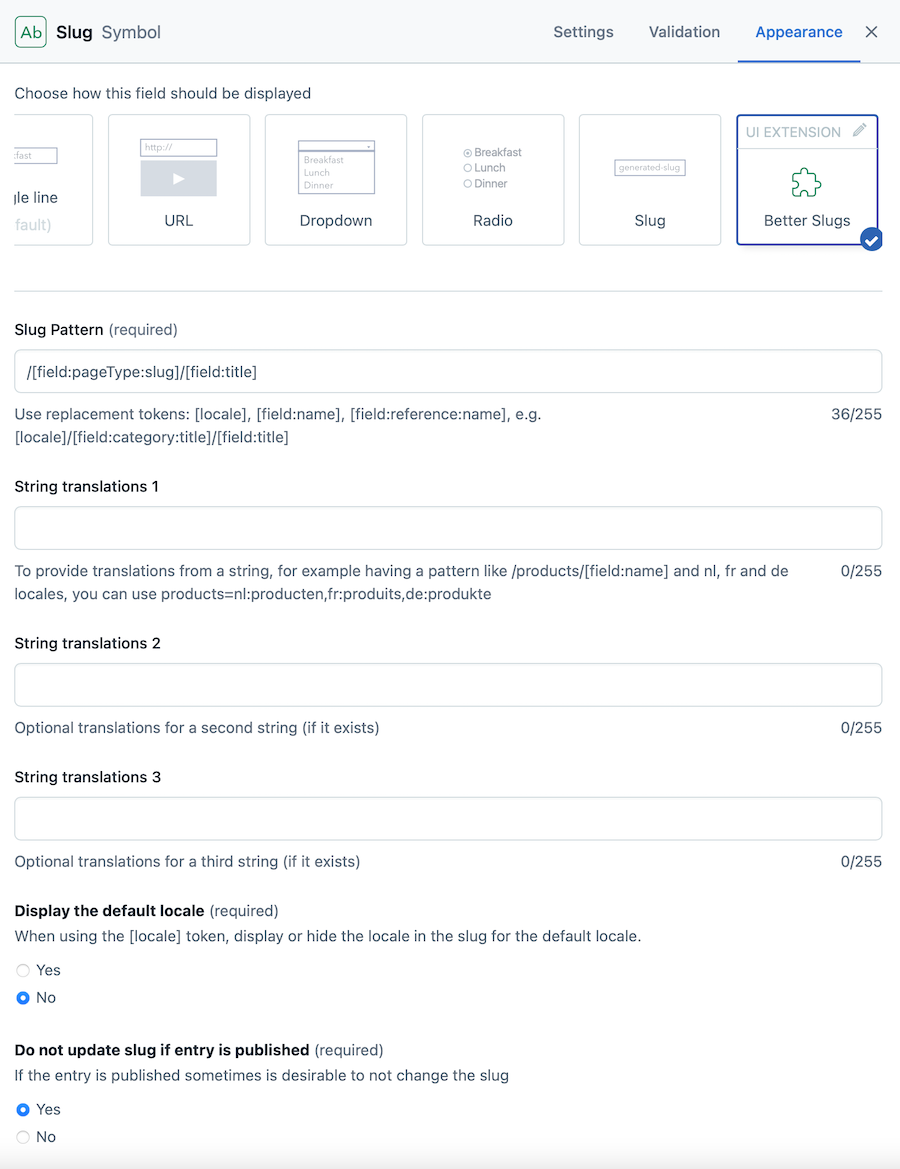 - On the Appearance tab ensure that Better Slugs is selected