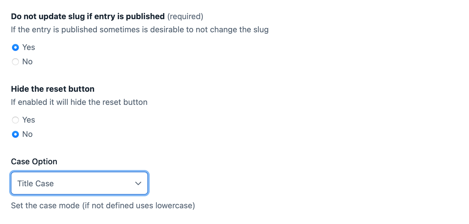Option to not update the slug automatically if entry is published, hide the reset button and set the case mode (lowercase, maintain case, title case):