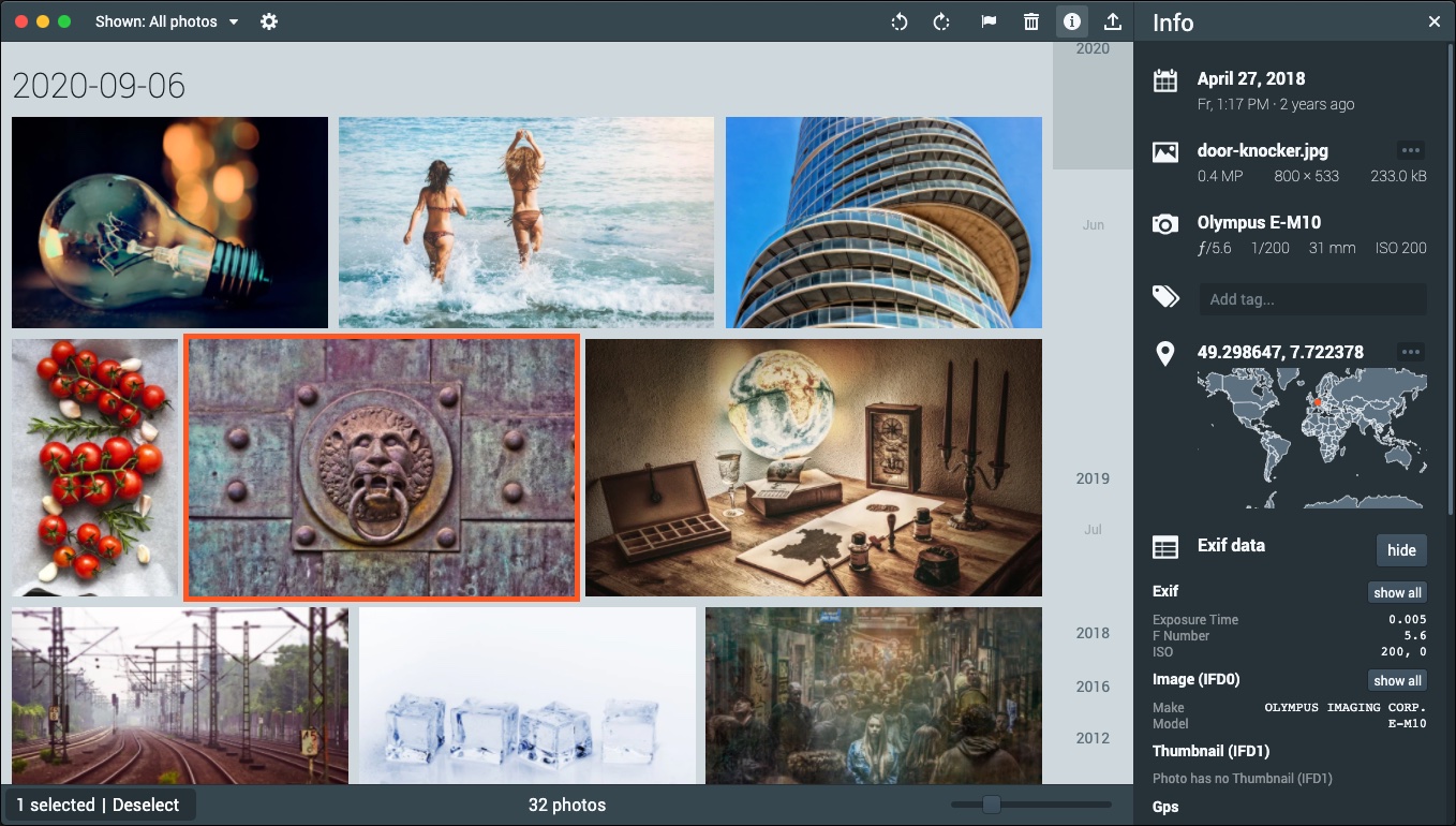 - Read various photo formats: JPG, PNG, TIF, WebP, HEIC / HEIF