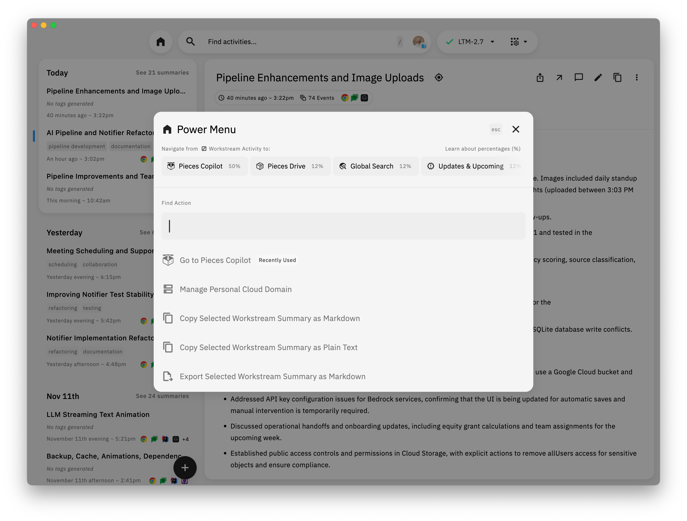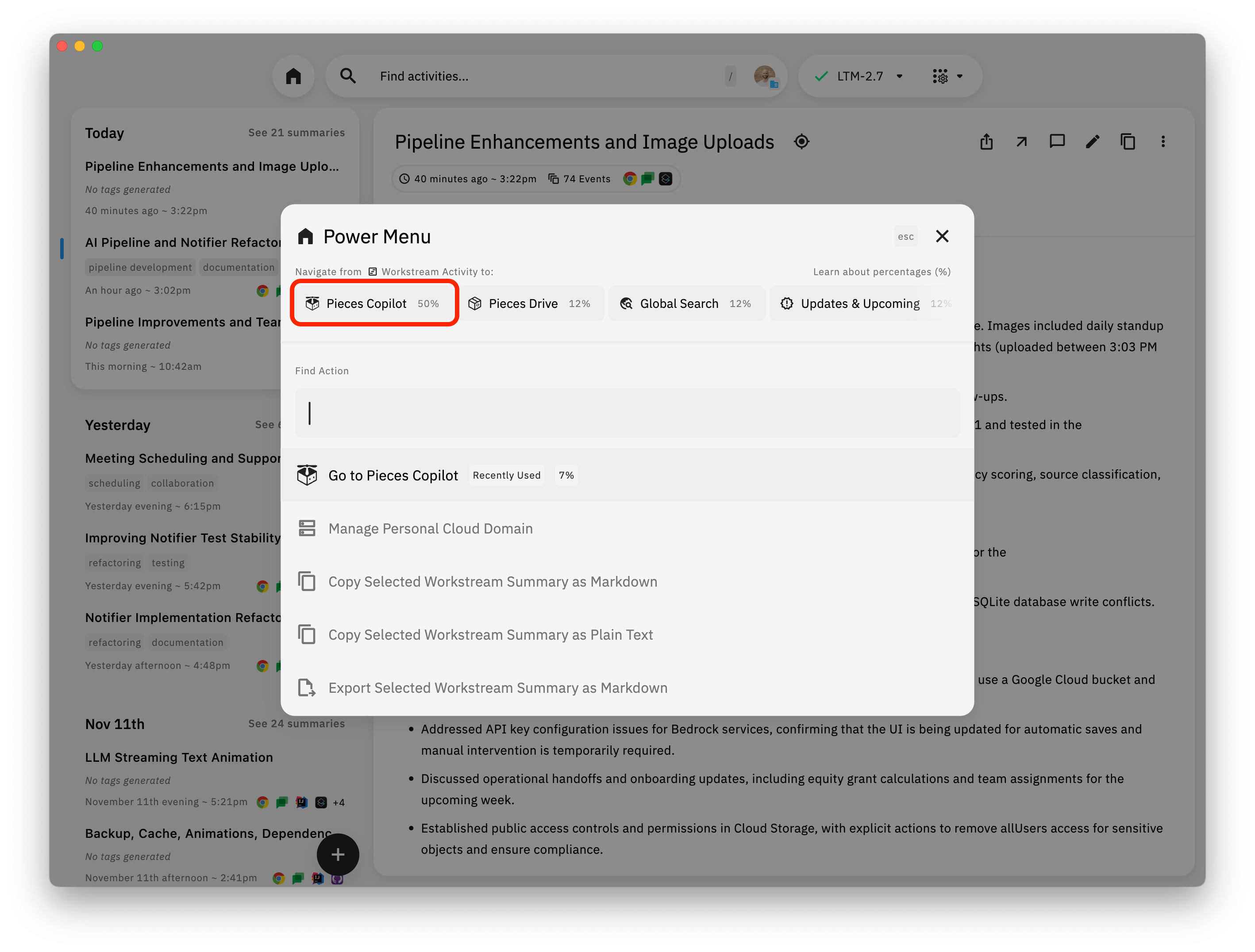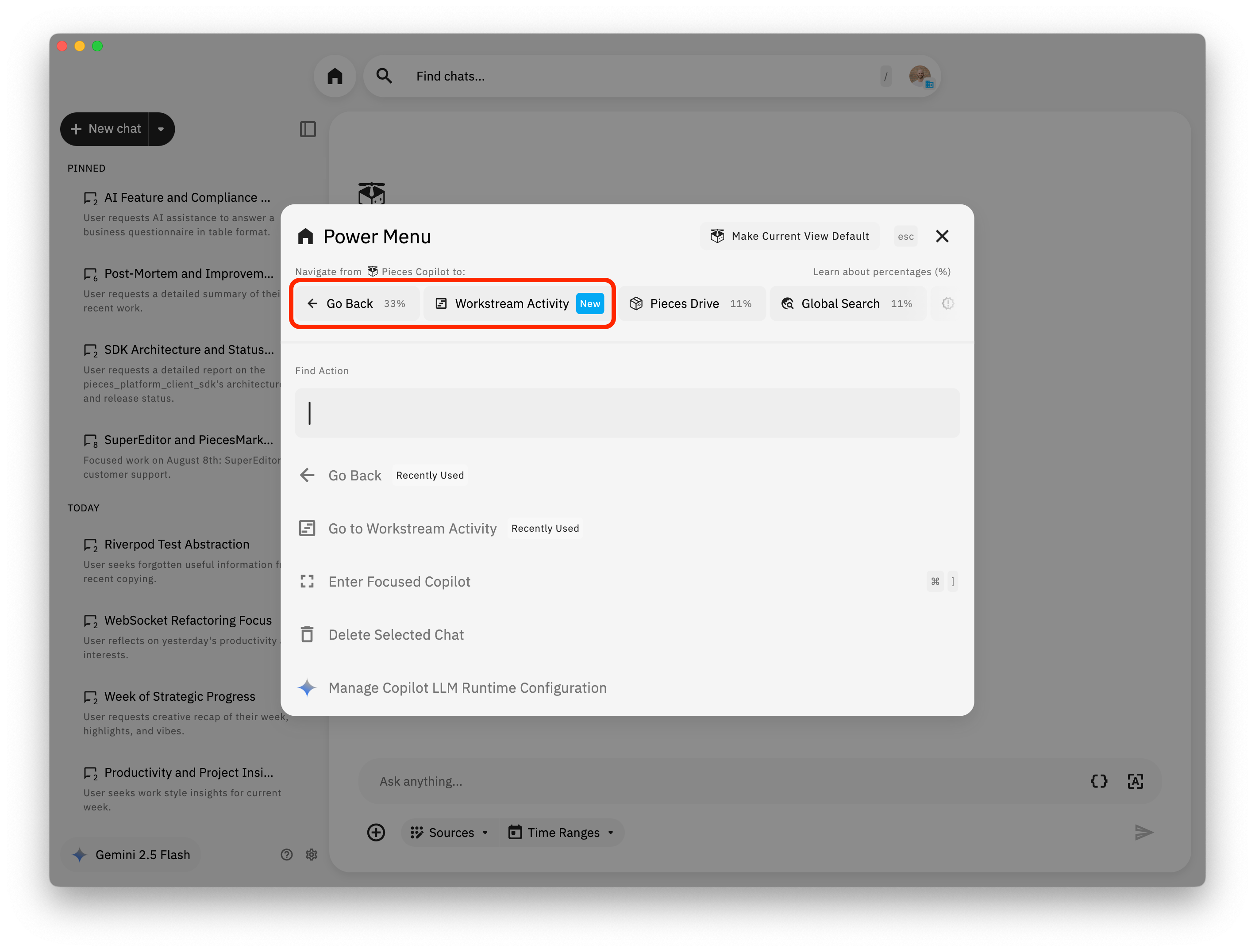 The Power Menu is your fast track to navigating Pieces. Whether you're jumping between Workstream Activity and Pieces Copilot, or starting new conversations from summaries, the Power Menu keeps you in the flow.