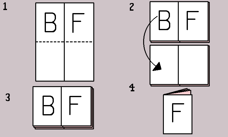 Stack the top pile (B | F) on top of the bottom. The front & back covers should be on top. Check the order of pages, making sure pages 14-15 and 42-43 follow each other.