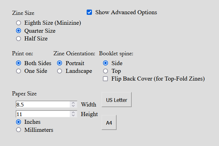 To prepare the zine for print, you could use a zine preparing tool like Zine Arranger by Nash High. Make sure that the final number of pages are a multiple of 8. Here are the settings I used to prepare the quarter zine for print in the Zine Arranger: