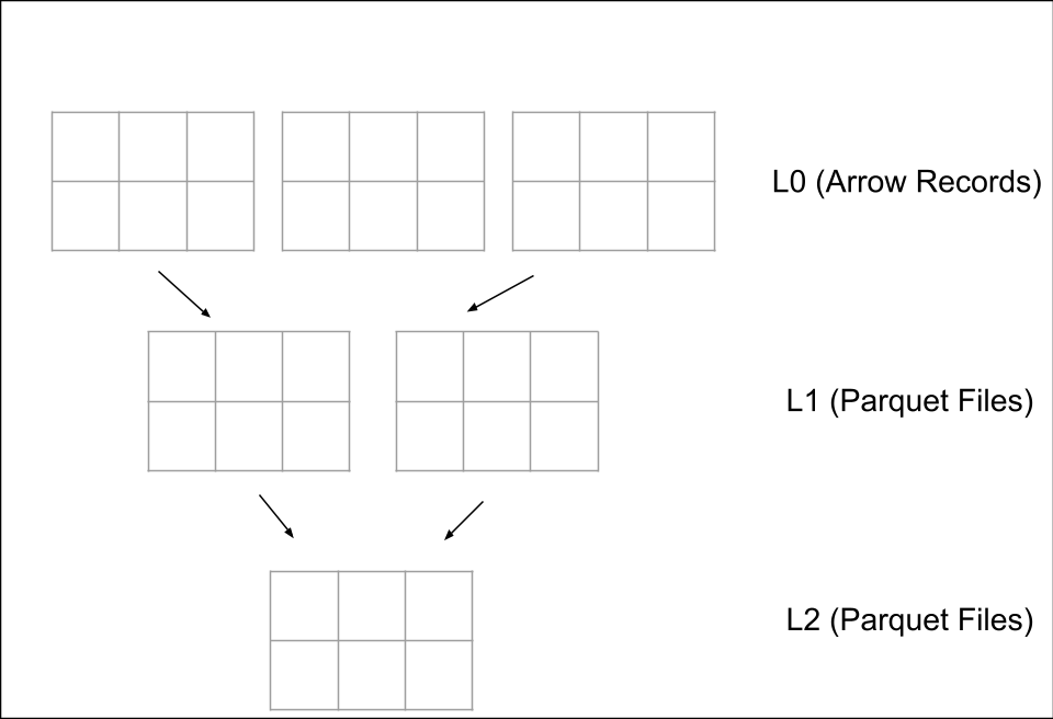 FrostDB maintains inserted data in an Log-structured merge-tree(LSM) like index. This index is implemented as lists of Parts. A Part containers either an Arrow record or a Parquet file. The first level (L0) contains a list of Arrrow records inserted as-is into the list. Upon reaching the maximum configured size of the level the level will be compacted into a single Parquet file and added to the next level of the index. This process continues for each configured level of the index until a file is written into the final level of the index.