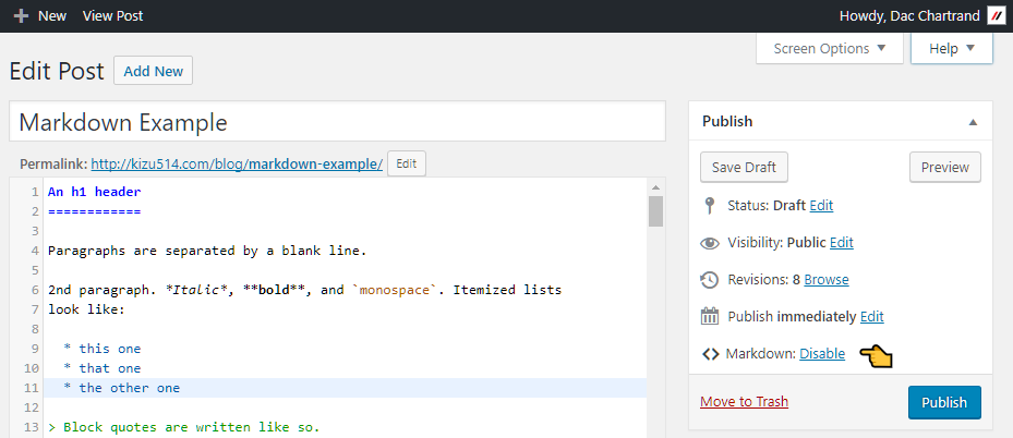 - Enable Markdown using the toggle in the Publish box (sidebar)