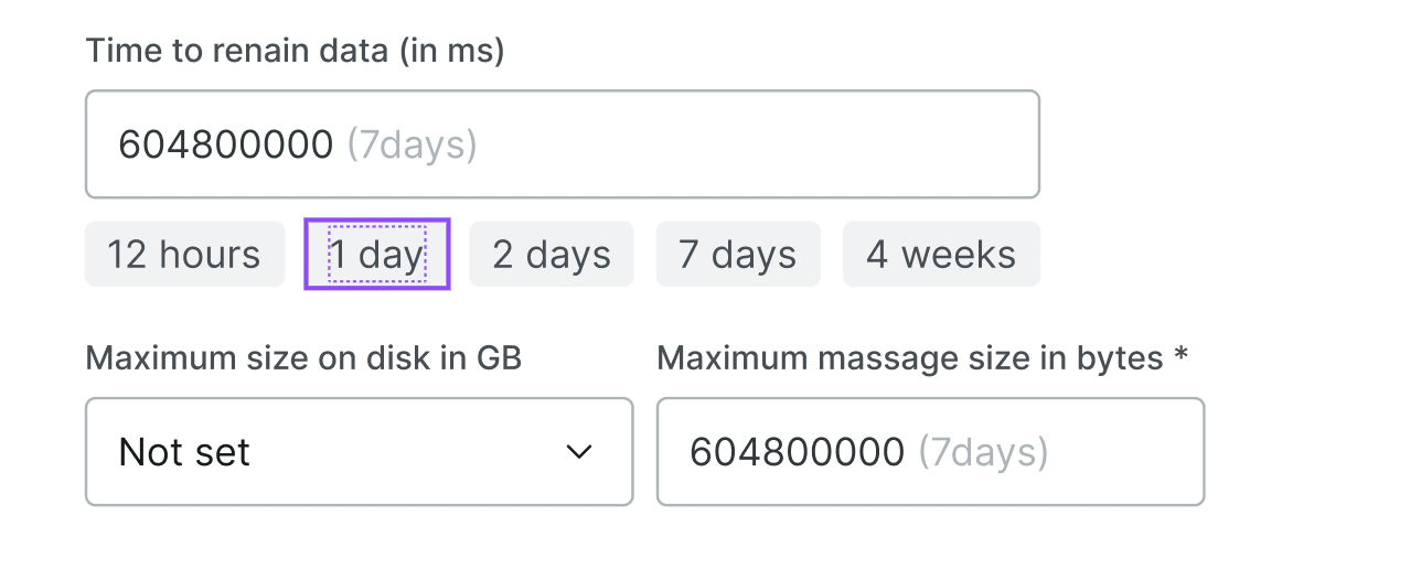 Placeholder "Time to retain data"should be for "Time to retain data (in ms)" field and placeholder "Maximum message size" should be for "Maximum message size in bytes *" field in case of letting these fields empty (first screenshot)