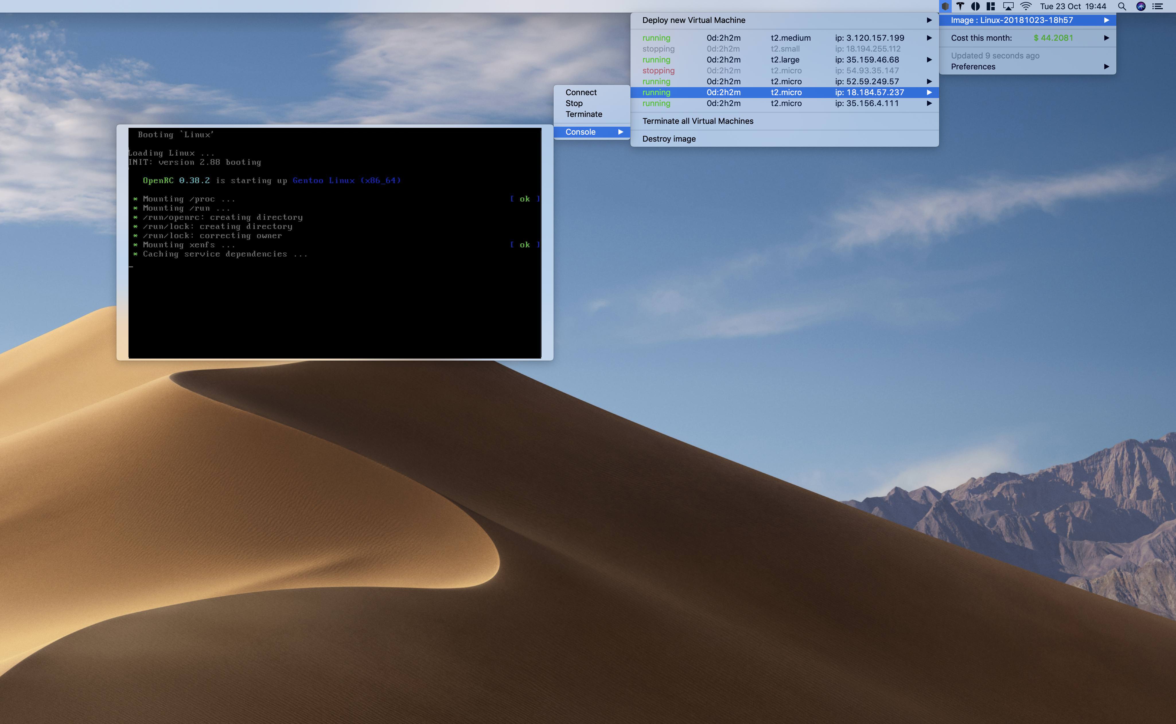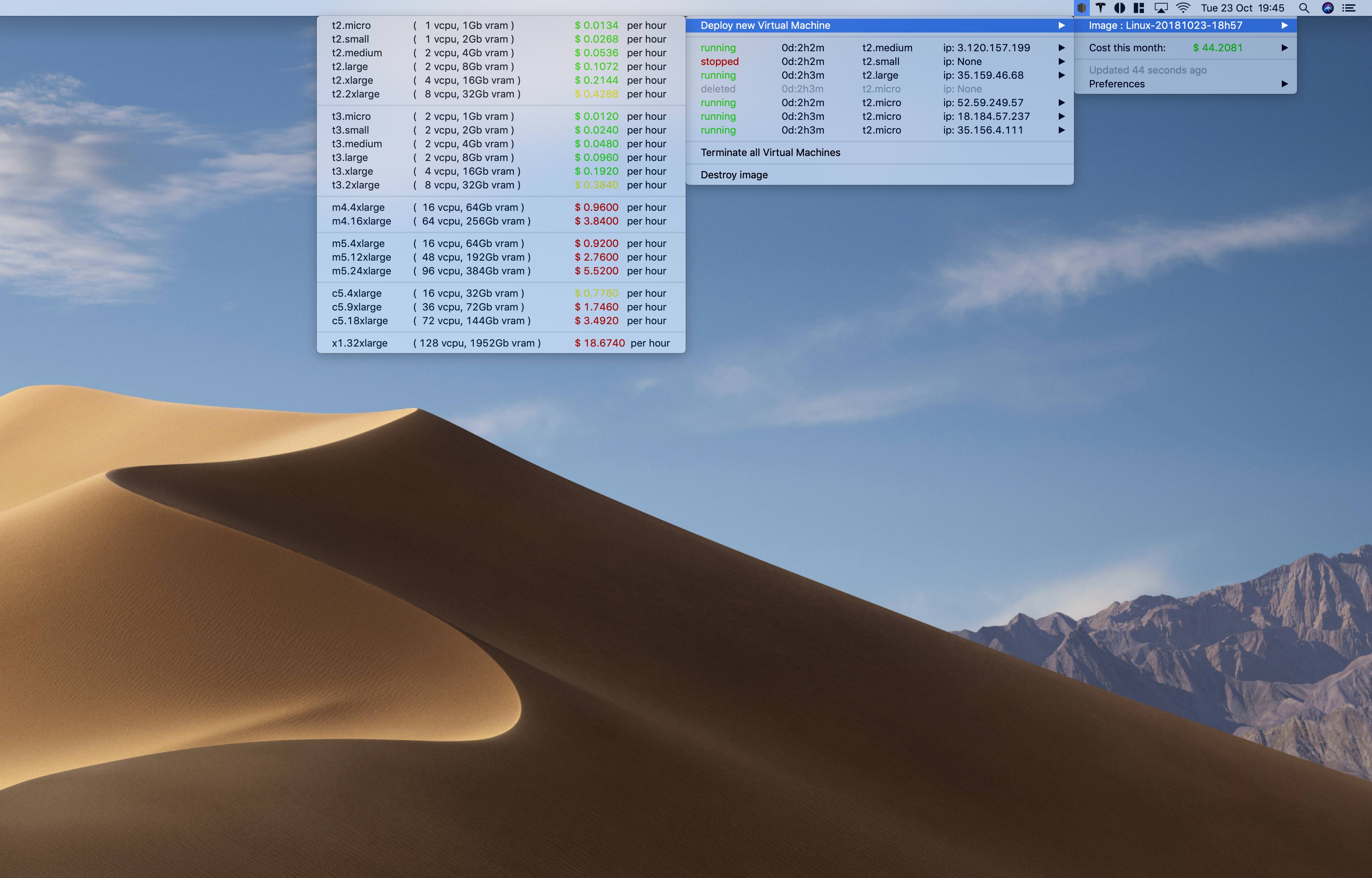 Displays information regarding your AWS EC2 virtual machines in the MacOS menubar. Allows you to create, connect to and terminate EC2 virtual machines. Create and destroy EC2 images from virtual machines. Check storage consumption