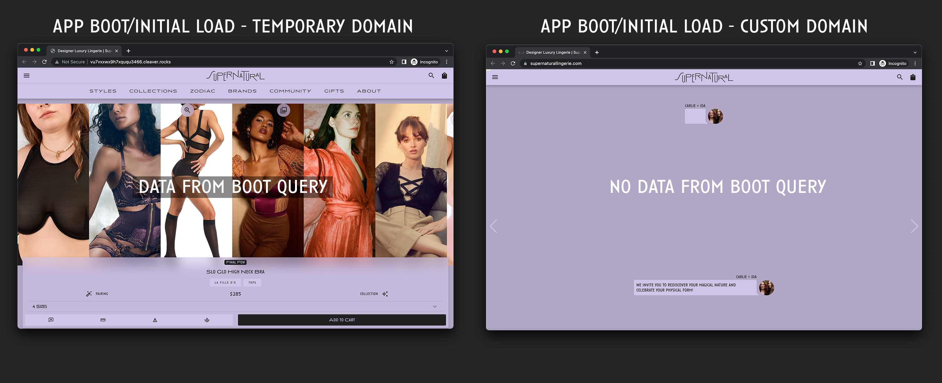 The custom domain site boots differently too. I have navigation and page data queried on boot. The temporary domain paints this data quickly onto the page. But the custom domain site does not.