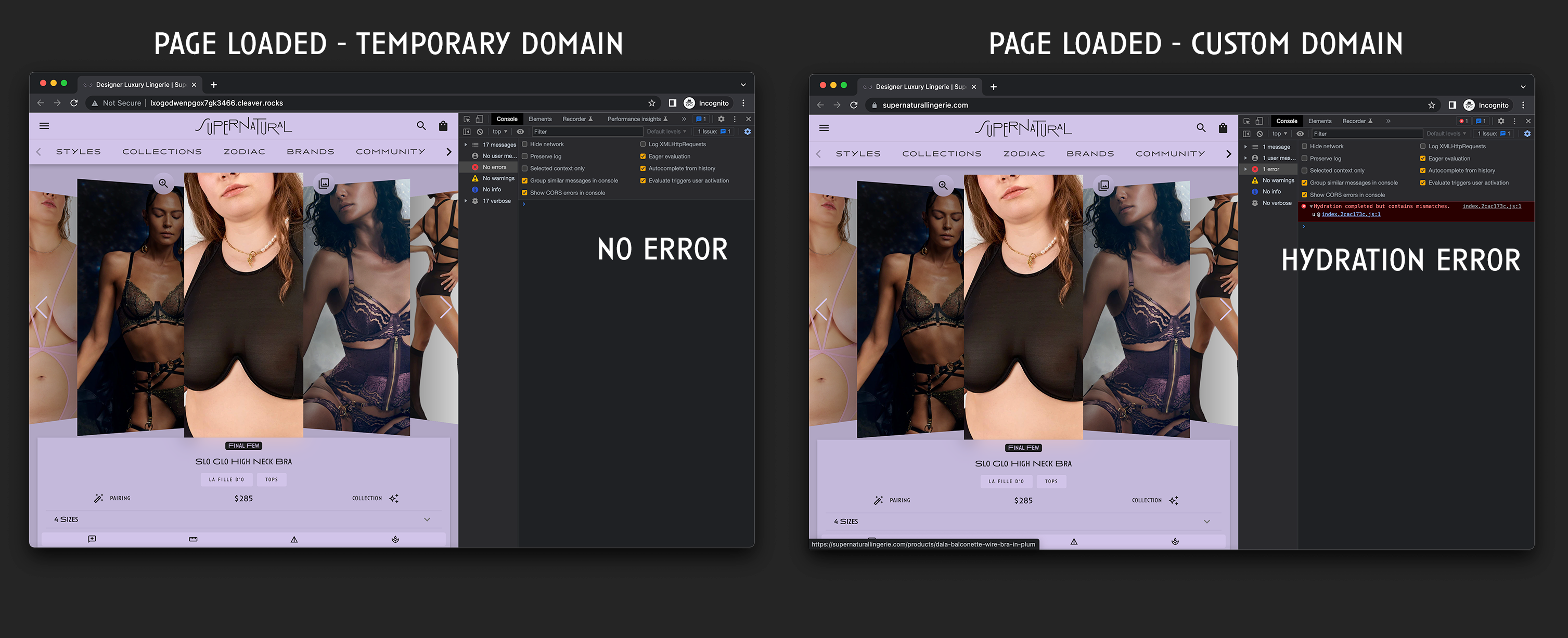 This is what both sites look like once the page is loaded. Again, both sites have the same identical code, deployed the same identical way. But the site with the hydration error (right) is on a custom domain: