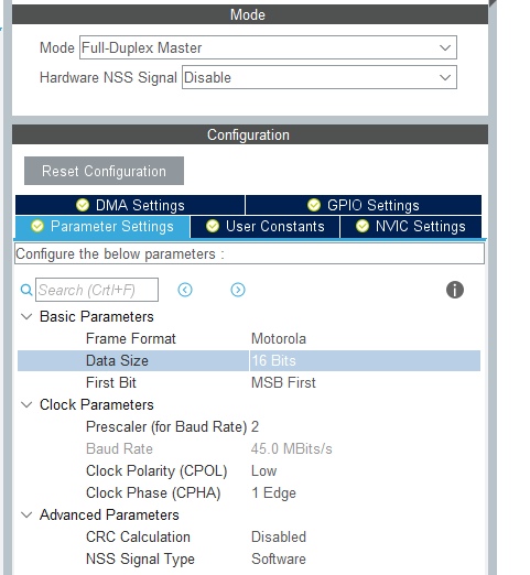 Пример показан на рисунке. Обязательно укажите длину посылки 16 бит. Дисплей прекрасно работает на частоте SPI 45 МГц и ниже, выше 45 МГц испытания не проводились. Использование DMA лишь замедляет работу из-за коротких посылок.
