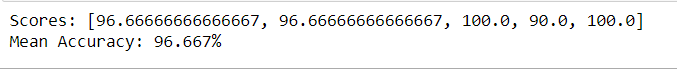 print('Mean Accuracy: %.3f%%' % (sum(scores)/float(len(scores))))Thus the python program successully implemented KNN classification algorithm.