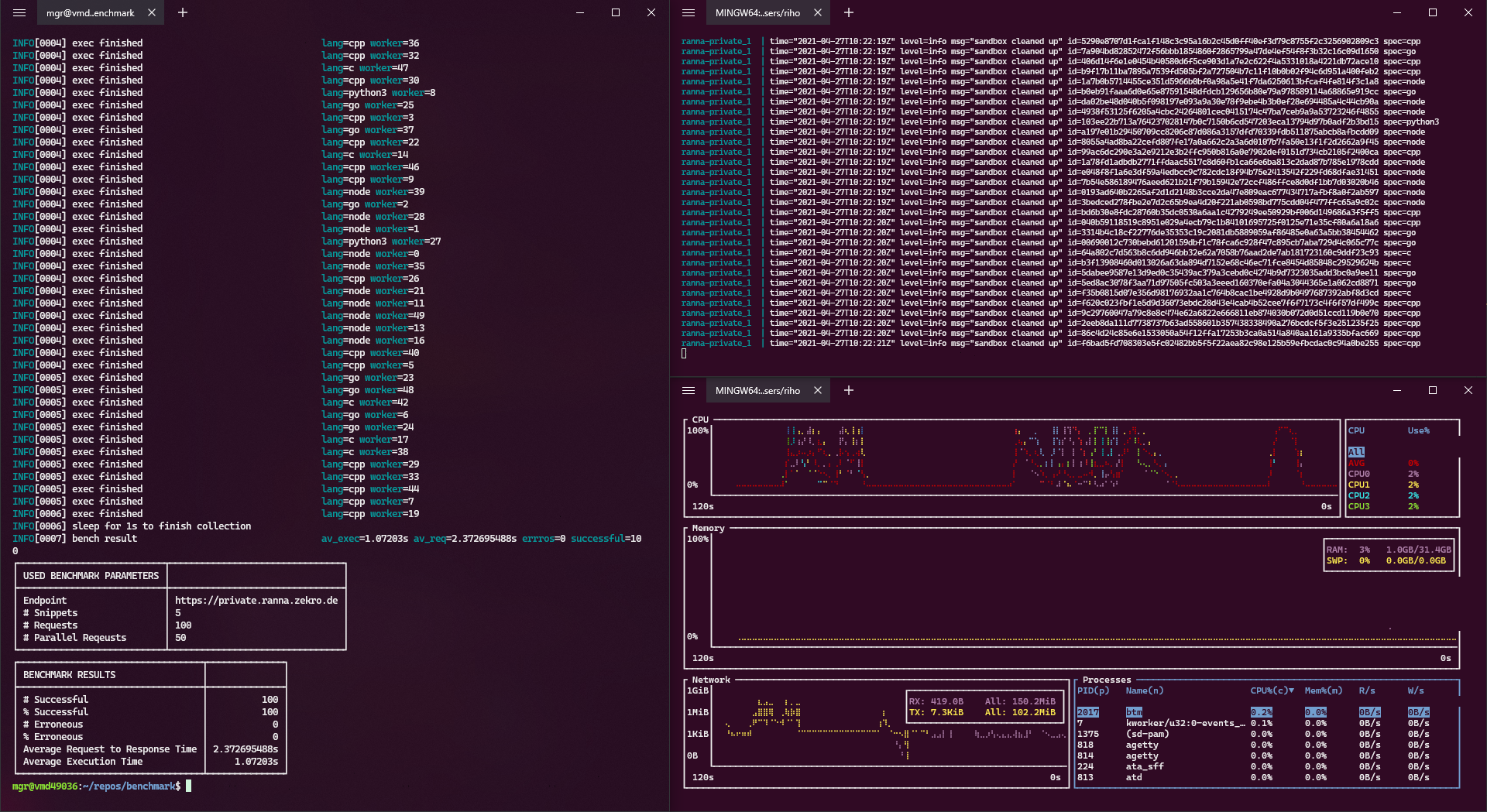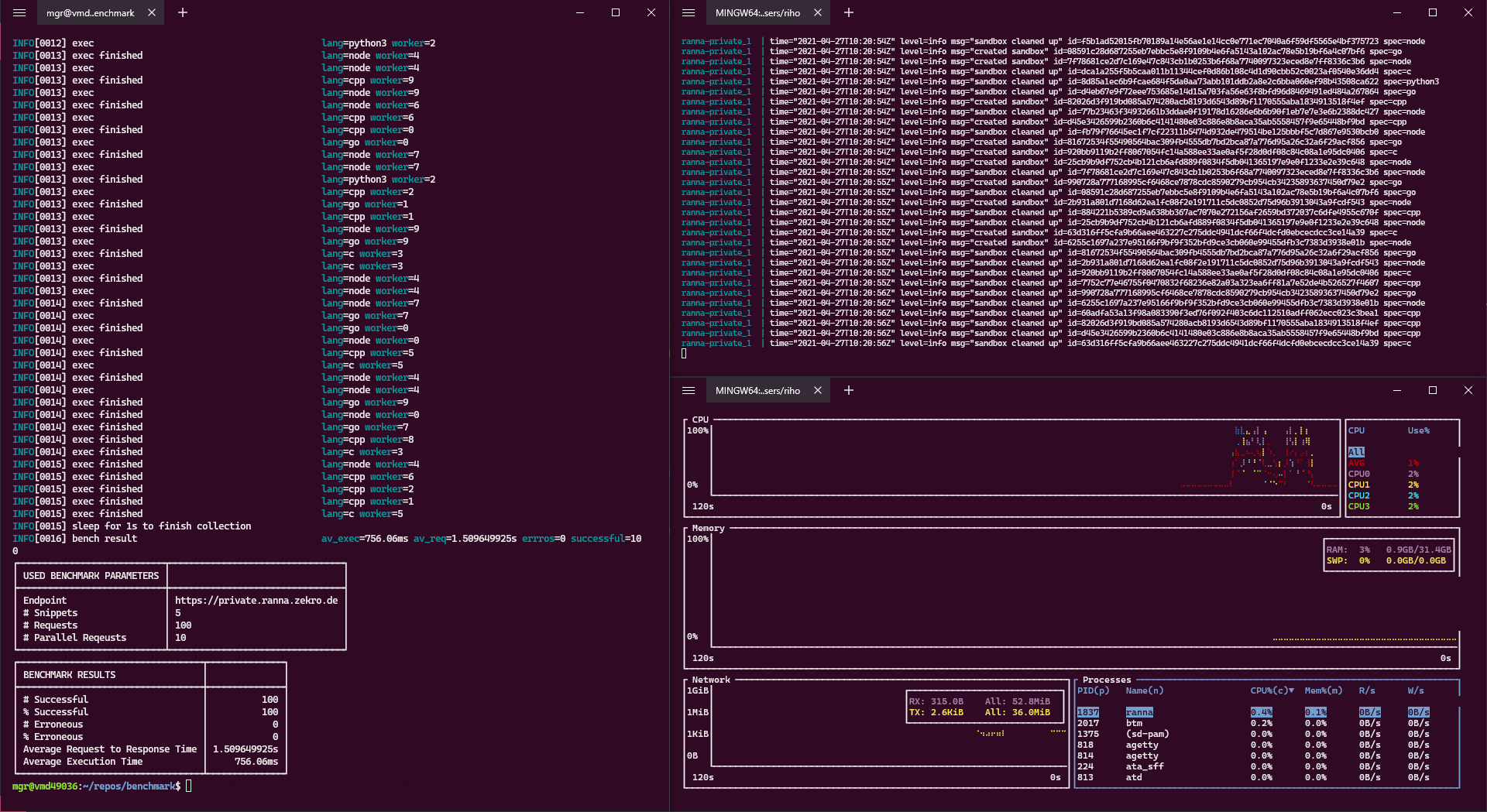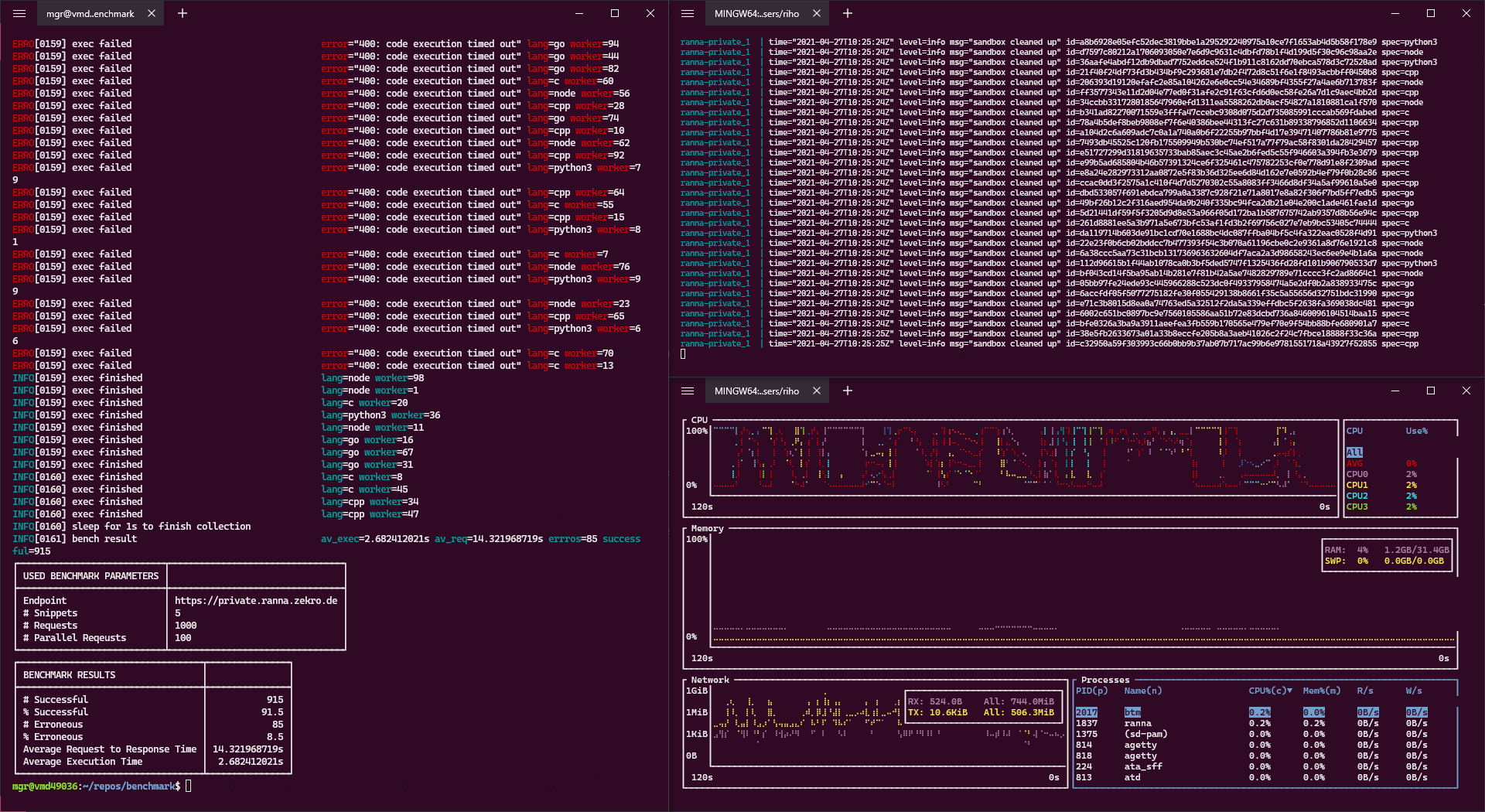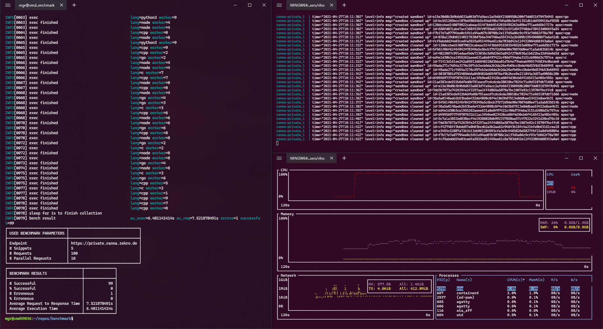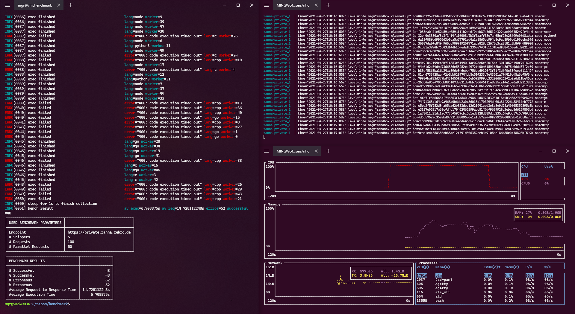 The current demo installation (ranna.zekro.de) is currently running on a low-spec 1C 2GB VPS. On this server, two ranna instances are running behind a traefik reverse proxy. https://public.ranna.zekro.de is publicly available and strongly rate limited. https://private.ranna.zekro.de is only accessable from whitelisted addresses and has no rate limits.