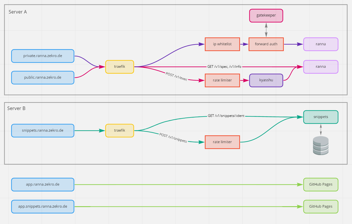 The two ranna instances are deployed on a seperate, isolated server. If an attacker achives container breakout from a ranna worker, there would be the risk of data leakage. To prevent this, the snippet API and database is deployed to a seperate server. The static files of the web app are served by GitHub Pages.