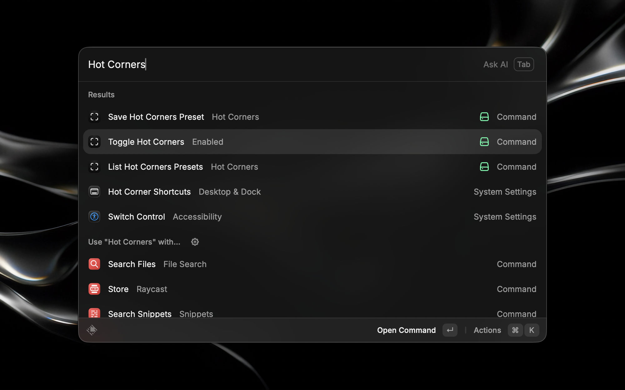 Control macOS hot corners from Raycast: save named layouts, switch between them, or turn all corners off and back on. Changes use the same settings as System Settings and apply the Dock preferences (the Dock is restarted so updates take effect).