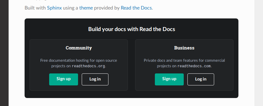 Show both readthedocs.org (Community) and readthedocs.com (Business) side-by-side in the docs footer, each with a small header, a one-line description, and direct sign up / log in links. Cards stack on narrow viewports.